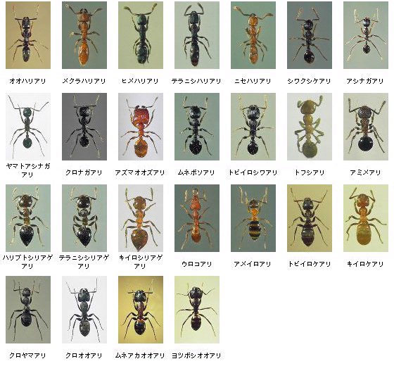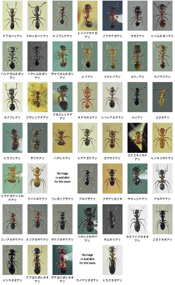 ノコギリハリアリ イトウハリアリ ヤマトカギバラアリ ワタセハリアリ ダルマアリ ベッピンニセハリアリ ツチクビレハリアリ クロキクシケアリ キイロクシケアリ オオクシケアリ ツボクシケアリ カドクシケアリ ツヤクシケアリ タカネムネボソアリ キイロオオシワアリ クロヒメアリ キイロヒメアリ ヤドリウメマツアリ キイロカドフシアリ オオウロコアリ ノコバウロコアリ ホソノコバウロコアリ ヒラタウロコアリ トカラウロコアリ ヌカウロコアリ セダカウロコアリ ヒメトビイロケアリ ミヤマアメイロケアリ モリシタケアリ タカネクロヤマアリ ツヤクロヤマアリ ケブカクロオオアリ アメイロオオアリ クサオオアリ ケブカツヤオオアリ チクシトゲアリ