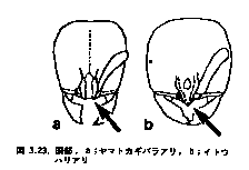 腹柄節前方背面の突起は弱く,背方から見て左右の突起の間の縁どりは着色していない。