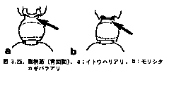 腹柄節前方背面の突起は顕著で,背方から見て左右の突起の間の縁どりは暗色化している。