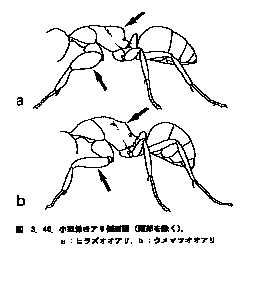 大型働きアリは頭部前方が切断されたように平らになる;小型働きアリの前脚腿節は