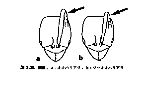 触角柄節が頭部後縁を越える長さは,触角第2節の長さにほぼ等しい;