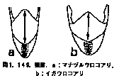 頭部側縁に長い縮れ毛をもつ;頭盾は幅より長さが著しく長い。 マナヅルウロコアリ