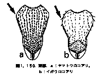 頭盾前縁は中央が突出する;触角柄節は基方約1/3のところでわずかに